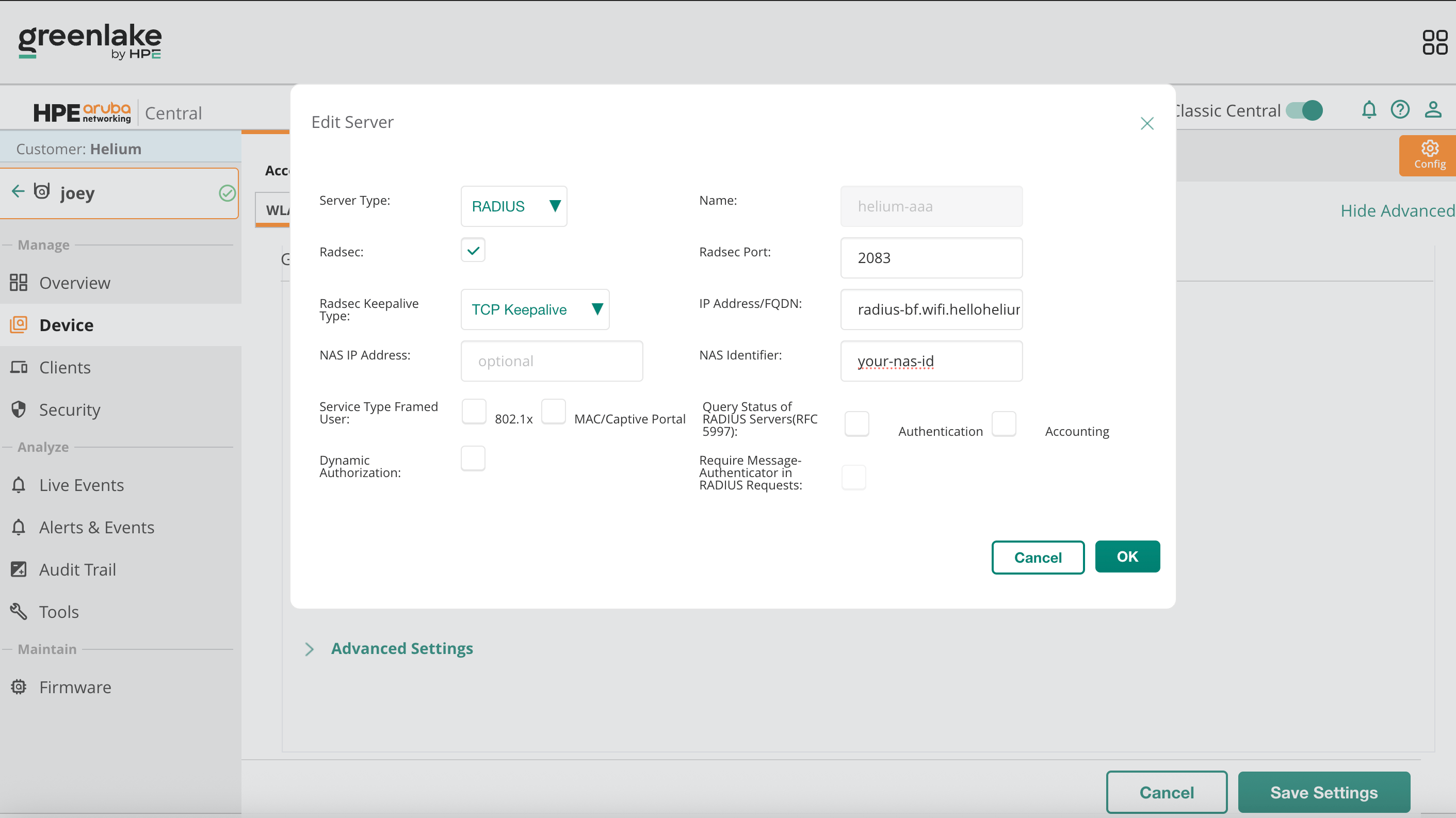Helium-RadSec - Under Advanced Settings, go to