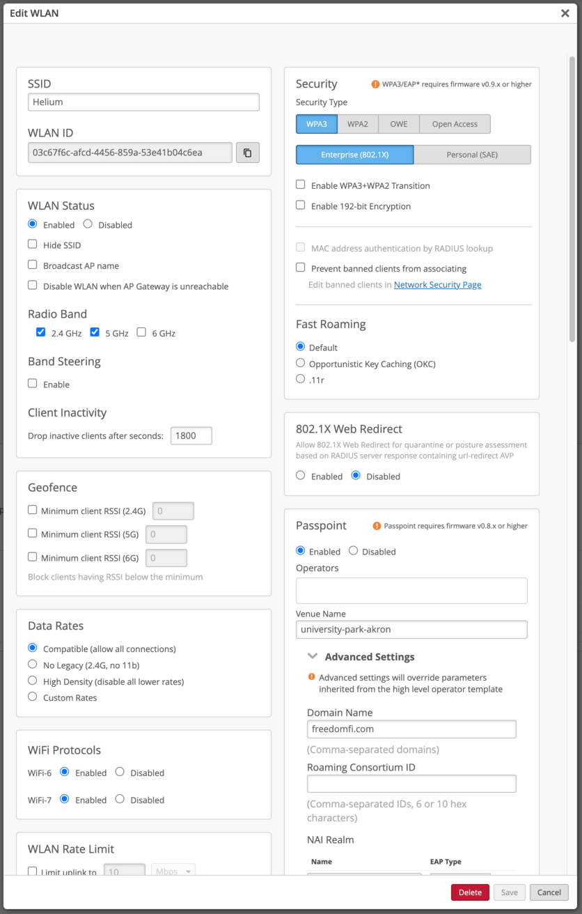 | Clients fail to connect | Check Passpoint parameters; verify device support for Passpoint; confirm Helium AAA approves the request. |