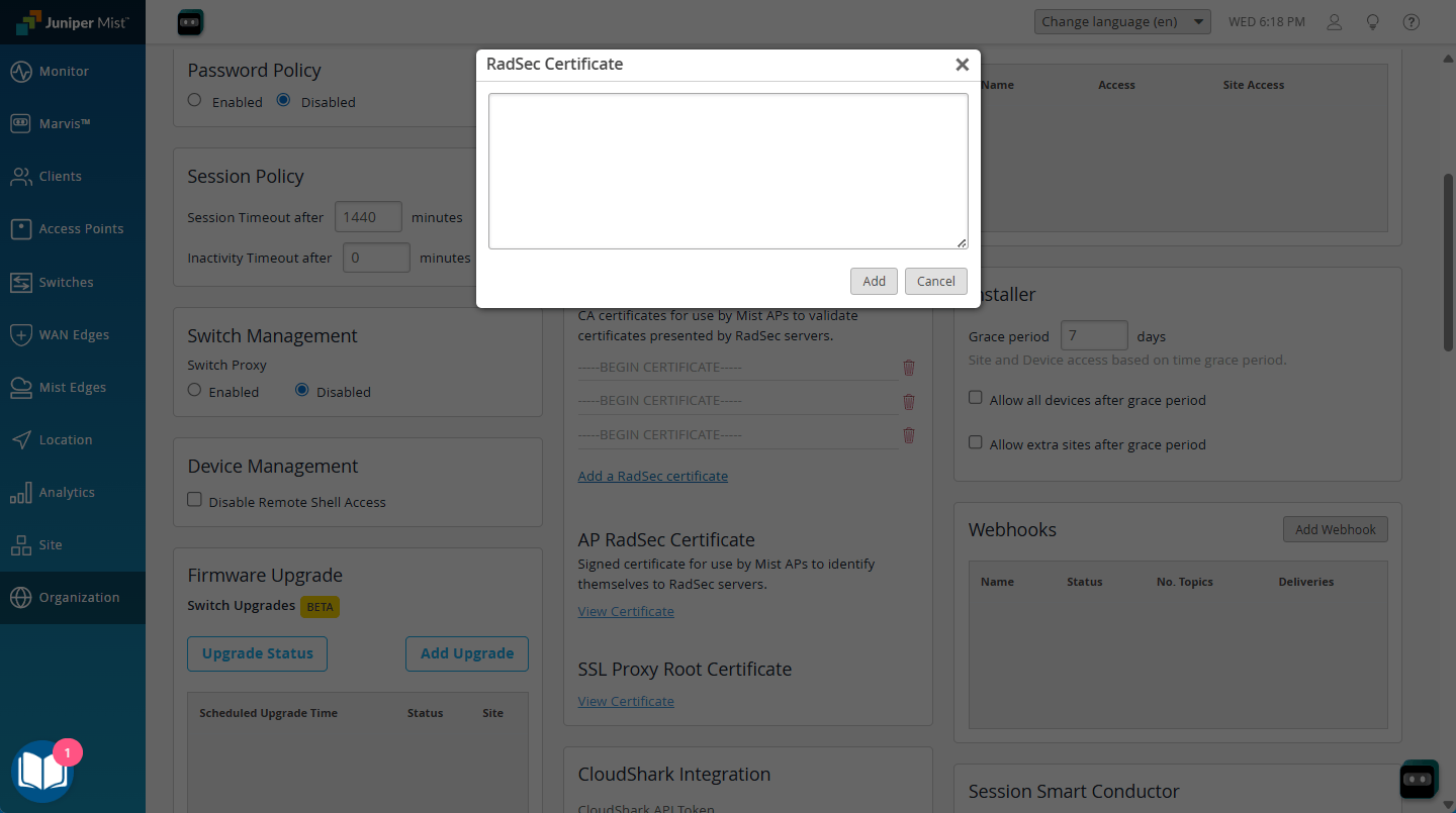 - Under RadSec Certificates, click the Add a RadSec Certificate link